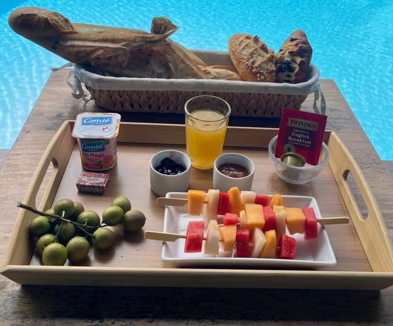 Baguette with a pastry, butter, local yogurt, fruit juice, two local jams, seasonal fruit salad, and tea or coffee of your choice.